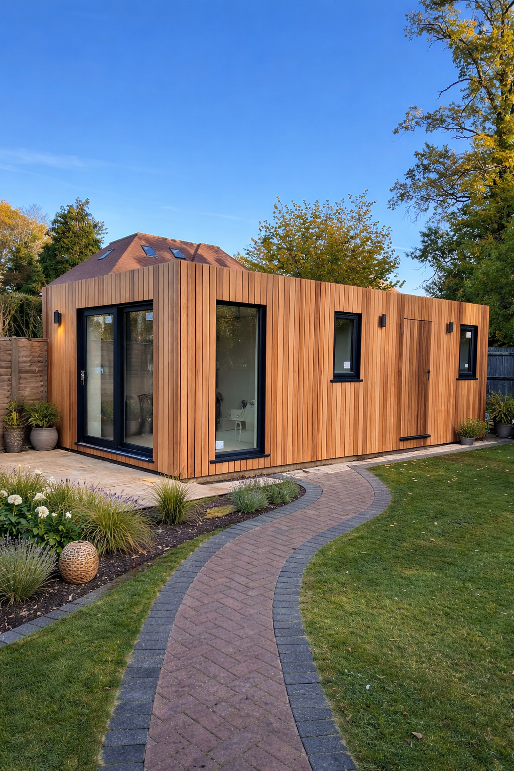 A fully custom-built oak garden pavilion featuring a complete outdoor kitchen, stone cladding, a slate roof, bar seating, and a covered dining area designed for year-round entertaining.