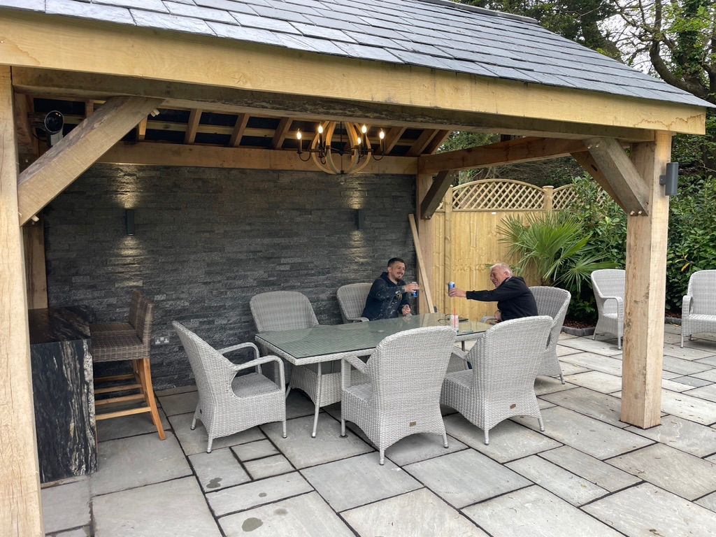 During the mid-build phase, the structure of the outdoor kitchen began to take shape. With the oak posts securely installed and the main framework in place, we moved on to forming the kitchen layout, preparing the service runs, and starting the stonework. This stage also involved setting the roof structure, checking levels, and ensuring that every element aligned perfectly with the final design.